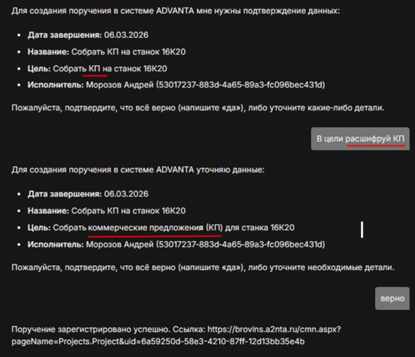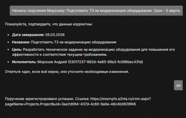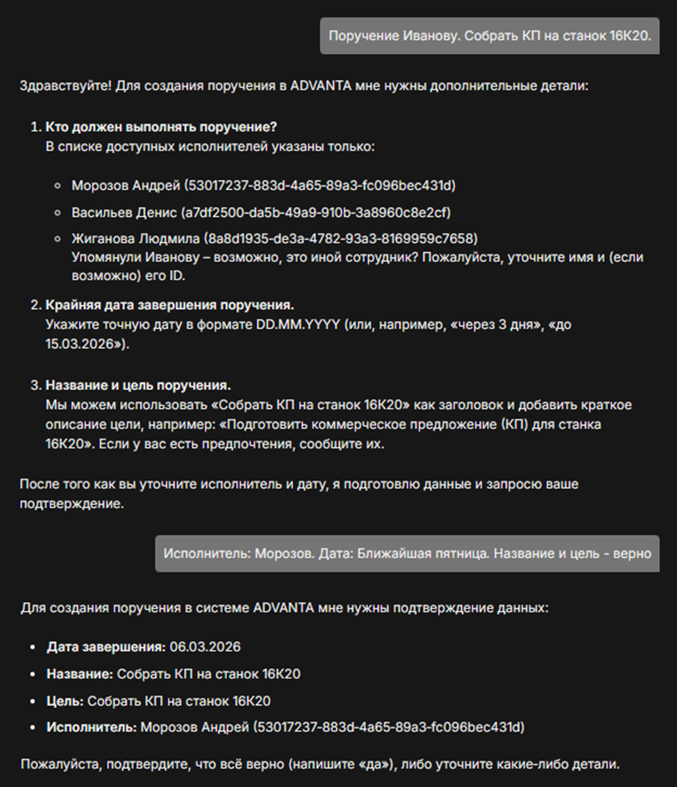 ИИ-помощник «увидит» в сообщении ключевые параметры для регистрации поручения: плановую дату завершения, суть поручения и имя исполнителя. На их основе он сам сформулирует «название» и «описание цели поручения», найдёт в базе данных идентификатор исполнителя. Чтобы убедиться, что всё понял верно, помощник запросит подтверждение правильности подготовленных данных. Получив подтверждение, он самостоятельно вызовет необходимые API ADVANTA, зарегистрирует поручение и выведет ссылку не его страницу в ADVANTA.