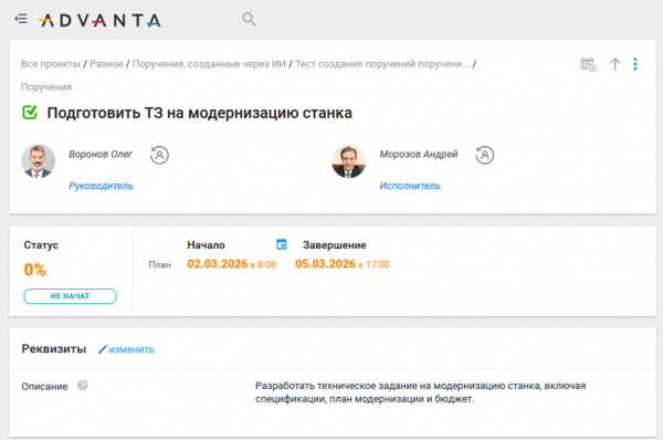 В ходе реализации проекта бывают ситуации, когда требуется оперативно дать поручение определённому сотруднику. Порой это приходится делать вне офиса, на ходу, когда под рукой лишь смартфон с небольшим экраном, на котором не удобно пользоваться интерфейсом приложения. В этом случае можно воспользоваться «ИИ-помощником по назначению поручений» в ADVANTA.
