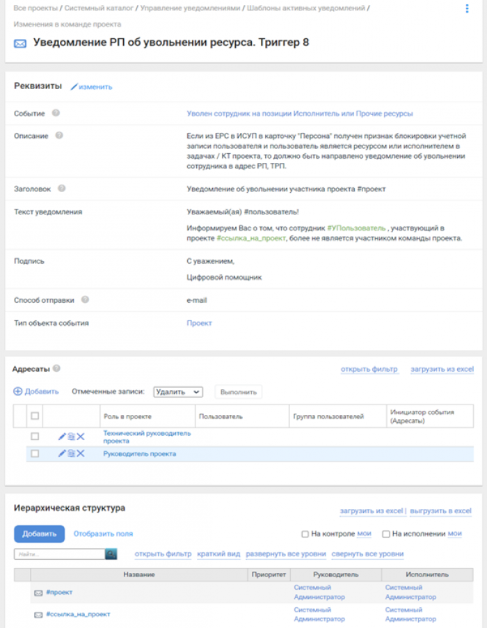 Пример настройки уведомления об увольнении ресурса на электронную почту пользователя: