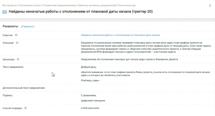 2. Настраиваемые уведомления, рассылаемые по событиям в проектах, содержащие текст с учетом специфики шага процесса с возможностью включения в уведомление инструкций о том, что необходимо сделать получателю.