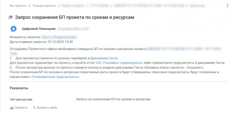 Пример настройки уведомления запроса на сохранение БП в дискуссии: