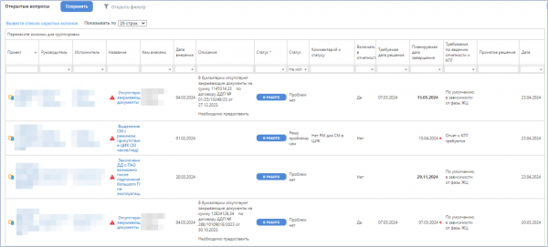 Система позволяет отобразить все вопросы в виде единого реестра с возможностью фильтрации по проекту, исполнителю, руководителю, статусу и сроку.