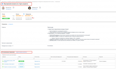 В карточке проекта Руководитель/администратор проекта обеспечивает организацию и документирование рабочих процессов, включая: - проведение совещаний; - создание поручений проекта; - фиксацию открытых вопросов; - пополнение базы знаний извлеченных уроков через создание специальных объектов в структуре карточки проекта: