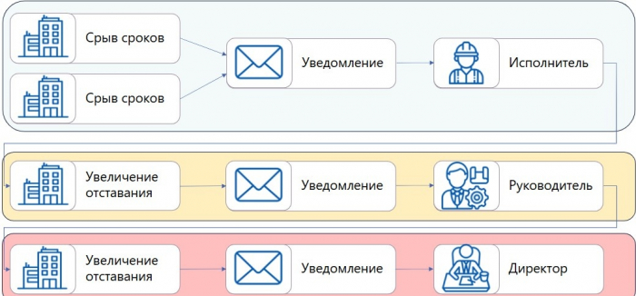 Уведомление о превышении плановых сроков относительно утвержденных отправляется на более высокий уровень (уровни непосредственного руководителя и директора) в случае, если исполнитель не отреагировал и не сообщил Руководителю проекта о необходимости внесения корректировок. Схема этого процесса представлена на скриншоте ниже.