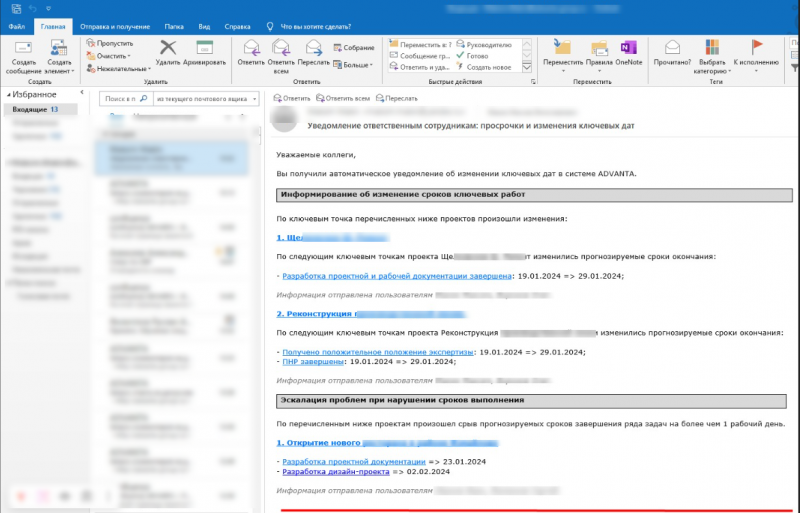 Уведомления формируются цифровым помощником автоматически по настроенному расписанию и отправляются в Outlook. Наполнение текста письма в зависимости от роли, которой адресовано письмо, может быть разным.