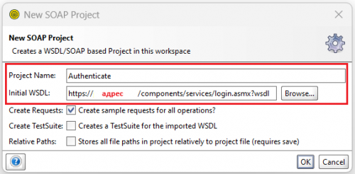 2. Назвать проект и добавить необходимый WSDL-файл Системы. В WSDL-файл добавить components/services/login.asmx со страницы Описание методов API: