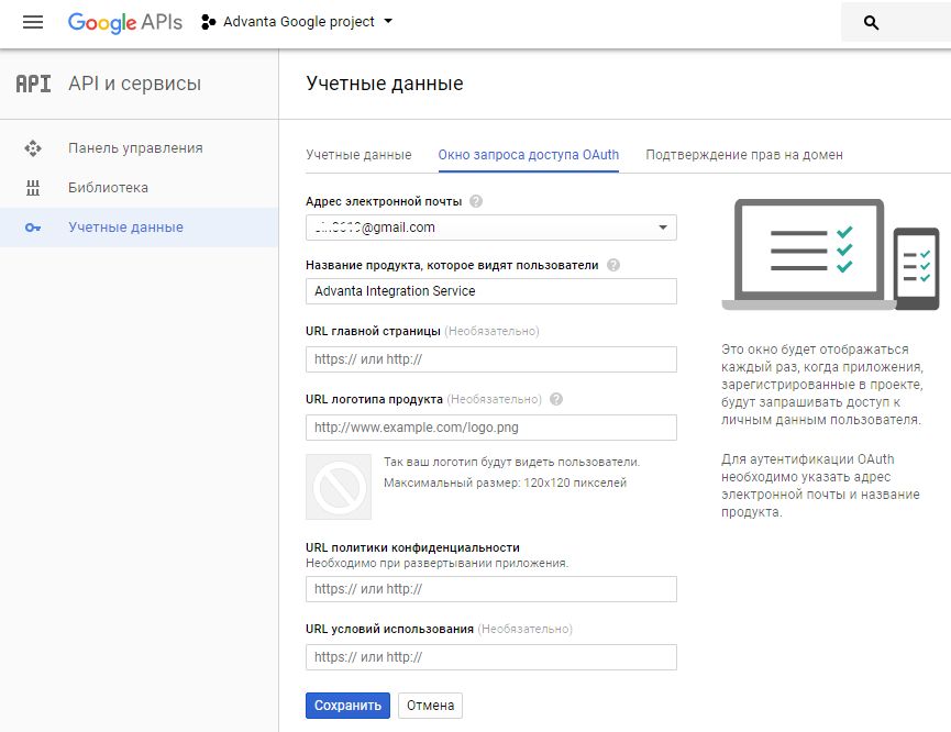 Перейдите «Учётные данные» → «Окно запроса доступа OAuth» (Рисунок 8). Параметр «Product name» будет отображаться в приветственном сообщении, пример которого приведен справа (Рисунок 8). При необходимости заполните остальные поля.
