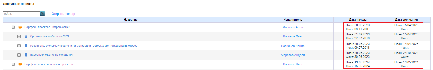 Также при добавлении нового объекта в табель, в портлете «Доступные проекты», в столбцах «Дата начала» и «Дата окончания» стали отображаться расчетные даты.