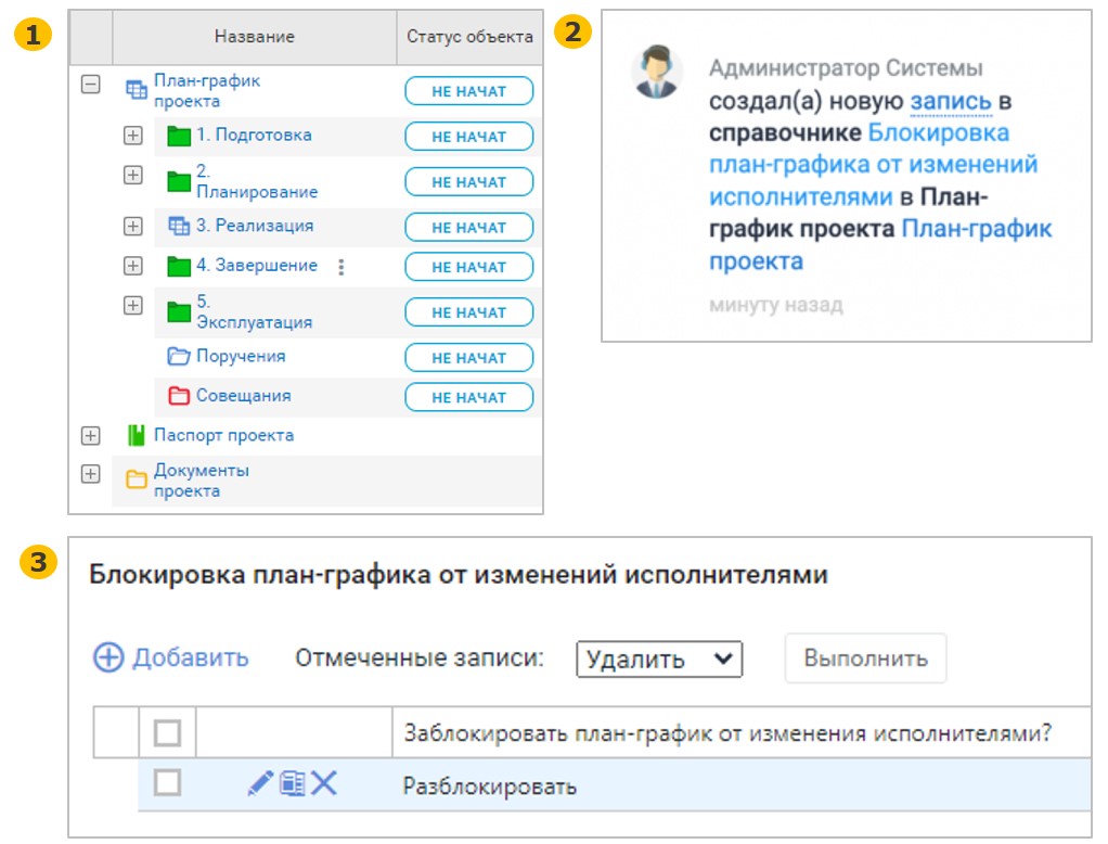• После завершения планирования проекта в справочнике «Блокировка плана-графика от изменений исполнителями» установите статус «Заблокировано»