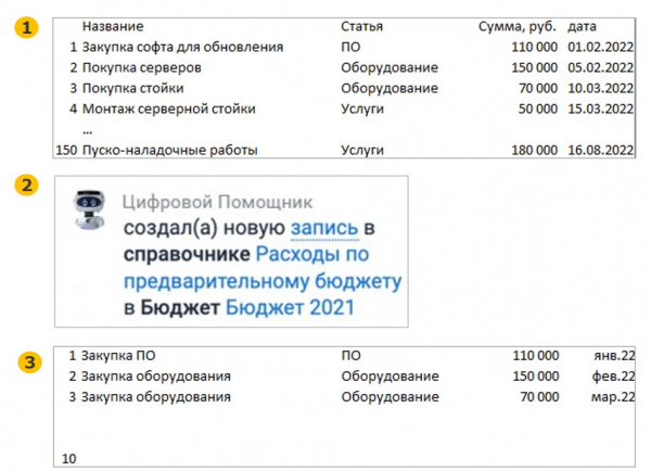 • Цифровой помощник сформирует записи в справочнике «Бюджет проекта», консолидируя согласованные затраты по статьям