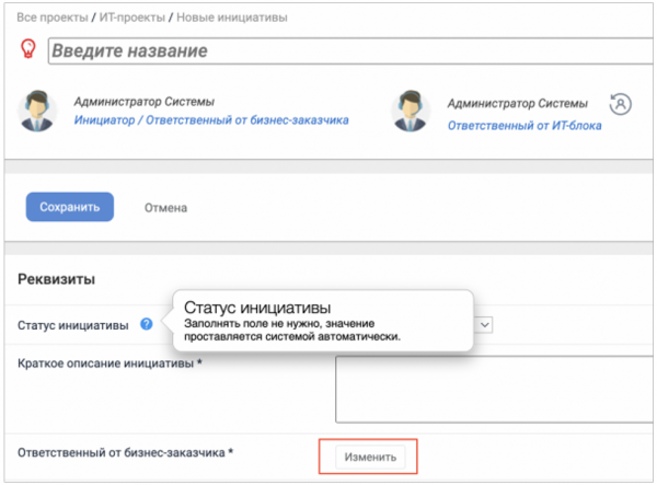 • Создайте новую инициативу, введите данные: название, описание, ответственного от бизнес-заказчика. Статус инициативы заполнять не нужно, в системе есть подсказка с пояснением