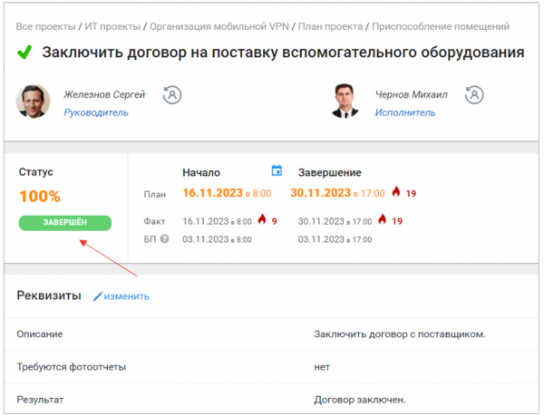 • По этому событию Цифровой помощник выполнит необходимые действия в связанных с документом объектах, например, завершит контрольную точку, переключит статуса задачи или проекта