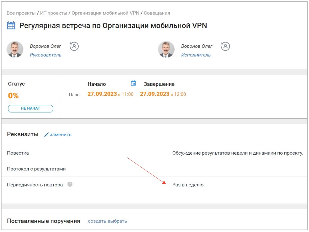 • Создайте совещание, пригласите участников и укажите периодичность проведения, например, раз в неделю