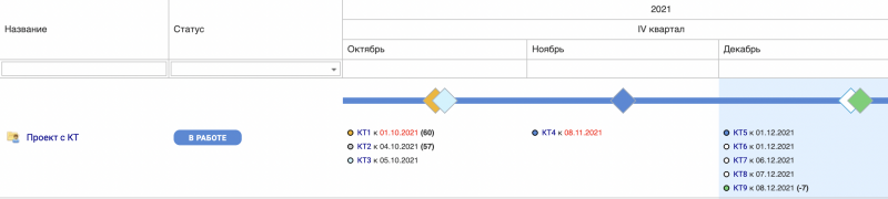 Отчёт типа "Проекты и работы" стал нагляднее - все отклонения по срокам на диаграмме контрольных точек дополнительно окрашены красным.